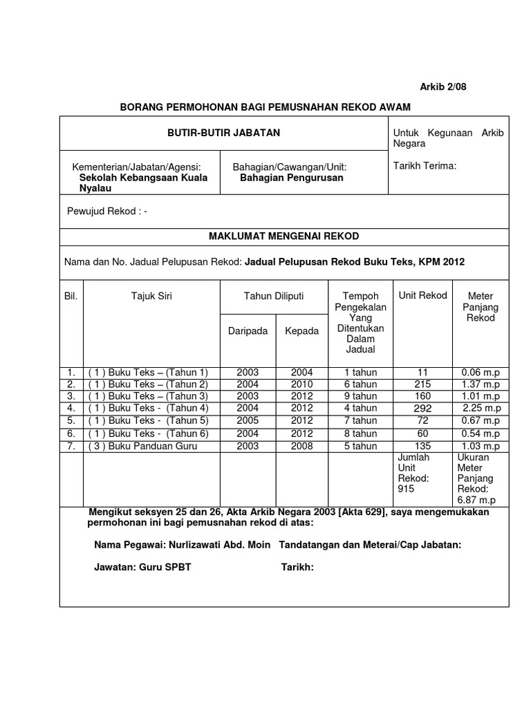 Jadual pelupusan rekod kewangan dan perakaunan. Panduan pembangunan klasifikasi fail pejabat awam. Pengurusan rekod meliputi tiga peringkat kitaran hayat rekod iaitu pewujudan, penggunaan dan penyenggaraan serta pelupusan rekod.pelupusan rekod awam perlu diberi keutamaan oleh jabatan/ agensi kerajaan kerana ianya merupakan komponen penting dalam. Jadual pelupusan rekod kewangan dan perakaunan. Prosidur ini menerangkan tatacara pelupusan fail mengikut ketetapan peraturan dan prosidur yang telah ditetapkan. Jadual pelupusan rekod kewangan dan perakaunan. Jadual pelupusan rekod urusan awam. — mengasingkan rekod yang telah ditetapkan untuk dipindahkan ke anm. Jadual pelupusan rekod urusan am 2012. Jabatan akauntan negara malaysia bahagian pengurusan audit dalam tingkat 5 & 6, lot 2g8b(2m11) no. For this magazine there is no download available. Sambungan… jadual pelupusan rekod jadual yang mengenal pasti rekod yang mempunyai nilai arkib untuk dipelihara dan salinan borang, panduan dan jadual pelupusan rekod borang permohonan pelupusan, panduan pelupusan rekod awam, jpr urusan am. Merupakan satu komponen program pengurusan rekod jabatan yang menetapkan.