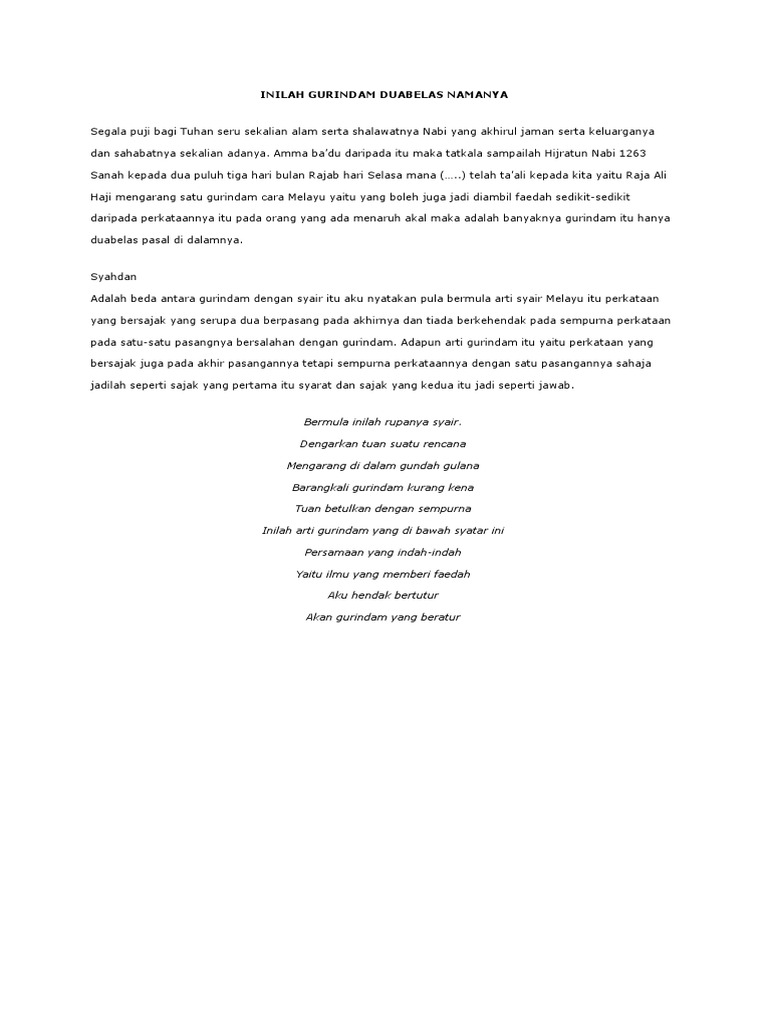 Ini gurindam pasal yang pertama: Seseorang yang menjaga tutur kata akan mendapat banyak. Tamatlah gurindam yang duabelas pasal yaitu karangan kita raja ali haji pada tahun hijrah nabi kita seribu dua ratus enam puluh tiga likur hari bulan rajab selasa jam pukul lima, negeri riau, pulau penyengat. Anggota kaki perlulah dipelihara dari melangkah ke. Bilangan baris dalam setiap rangkap adalah sama, iaitu dua baris serangkap.3.