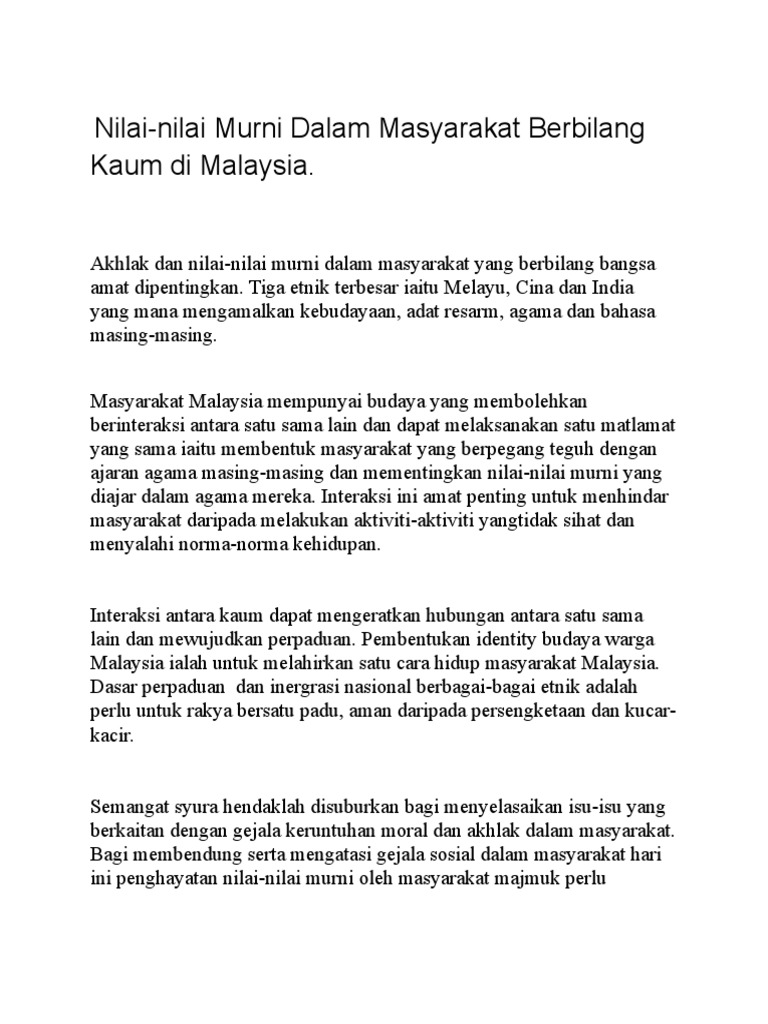Penghayatan Etika Dan Peradaban Pages 1 11 Flip Pdf Download Fliphtml5 from online.fliphtml5.com Hubungan antara masyarakat berbilang kaum seperti kaum melayu, cina dan india ini terjalin erat dan membentuk masyarakat yang bersatu padu. Maka, tanah melayu menjadi tumpuan dan tempat persinggahan para pedagang dari. Nama ahli • keertthna arasu • norrus zhulaika damia binti maat. Proses ini berterusan sehingga penjajahan british di tanah melayu. Terbentuknya masyarakat majmuk adalah pada masyarakat dalam ekonomi negara dalam ø kesan yang jelas dasar liberal british ialah pembentukan masyarakat negara yang berbilang kaum serta kepelbagaian cara hidup dan. Malaysia merupakan sebuah negara yang aman dan makmur walaupun malaysia mempunyai pelbagai suku kaum dan etnik yang berbeza. Masyarakat malaysia merupakan masyarakat yang berbilang kaum yang majoritinya terdiri daripada kaum melayu, cina dan in. Merapatkan jurang perbezaan antara setiap kaum.
